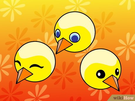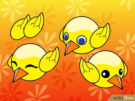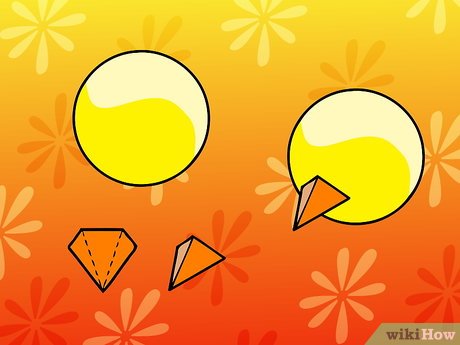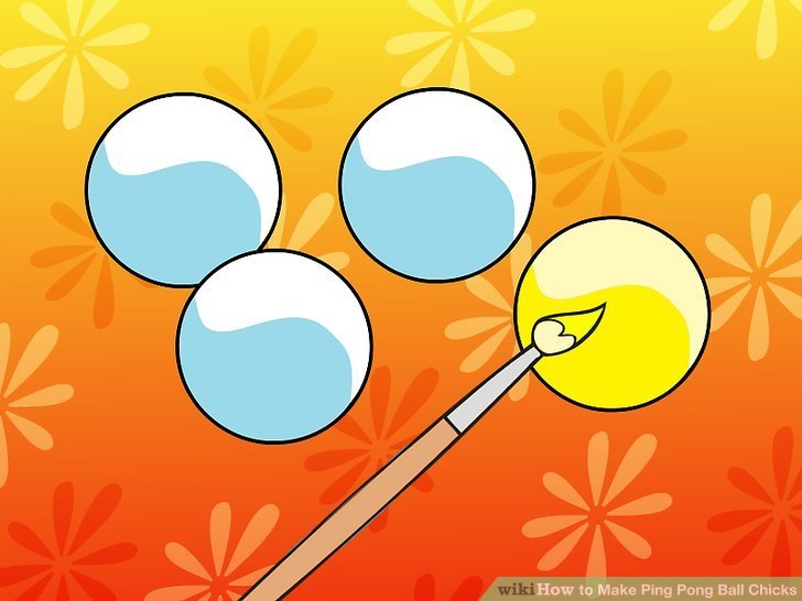 قم بتلوين الكور بالأصفرقم بقص المنقار من الفوم أو القماش البرتقالي ولصقها على الكرةألصق العيون المتحركة على الكرة أو قم برسمها باستخدام الماركرقم بقص الأجنحة من الفوم الأصفر ولصقها على الكرةأستخدم الأعواد المرنة لعمل ثلاثة أصابع في كل رجل، ثم ألصقها بالكرة