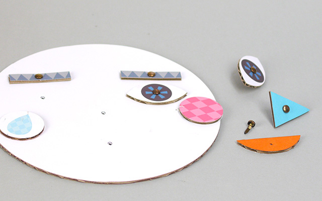 - إدخال خيطاً في أعلى الدائرة ثم ربط طرفي الخيط جيداً، ثم تمرير الخيط عبر الوجه وثبته من الخلف لتصبح الدائرة الصغيرة متدلية (كما بالصورة) ليسهل قلبها على الجهة التي يريدها الطفل.