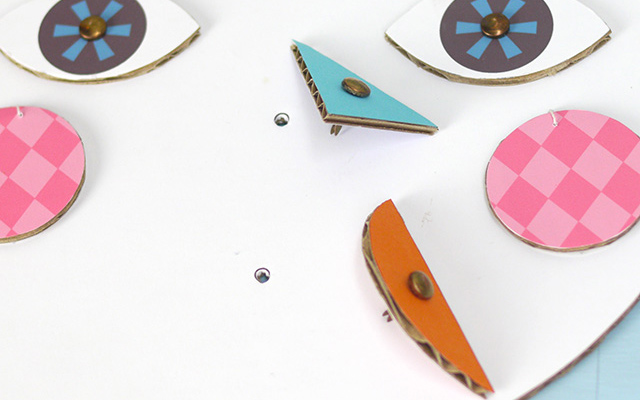 - إدخال المثبتات/المسامير في الأماكن المحددة في العينين والأنف والفم والحواجب، ثم أغلقهم من الخلف.